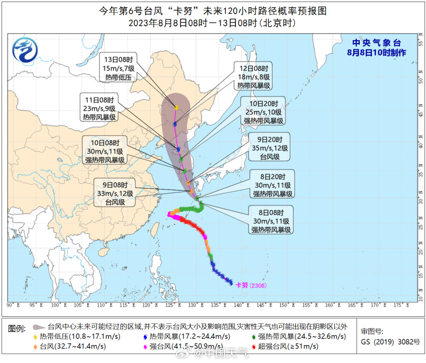 中央气象台8月8日10时继续发布台风蓝色预警:今年第6号台风“卡努”(KHANUN)强度将有所增强,并逐渐向朝鲜半岛南部沿海靠近。中央气象台预计,10日起,“卡努”外围云系将会影响我国东北地区,带来明显降雨。