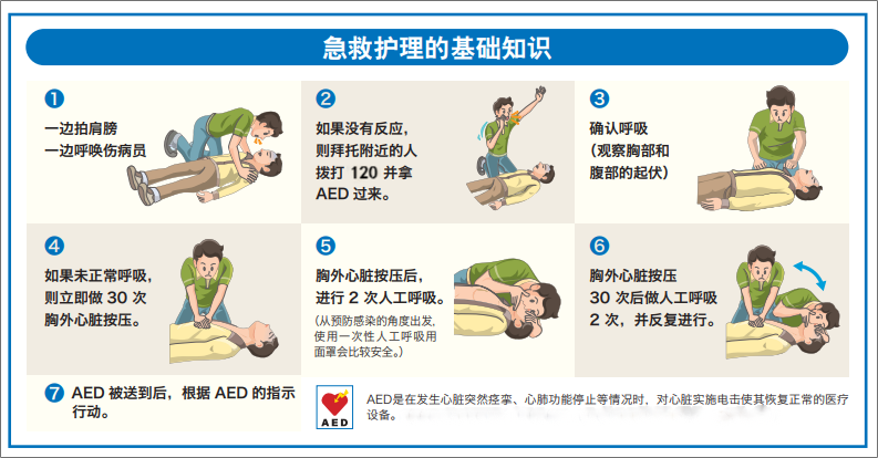 持续以30:2的比例实施胸外按压和人工呼吸,直到接受过更高级培训的人员到来接手,或患者有意识、有呼吸为止。若AED到达,应立即开启电源,并按照语音提示操作。