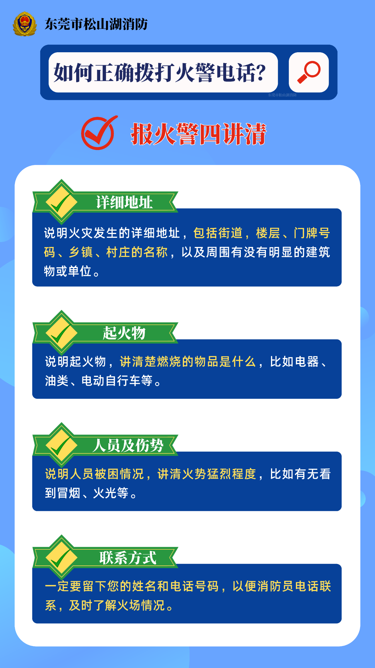并讲清详细地址、起火物、人员及伤势、联系方式等