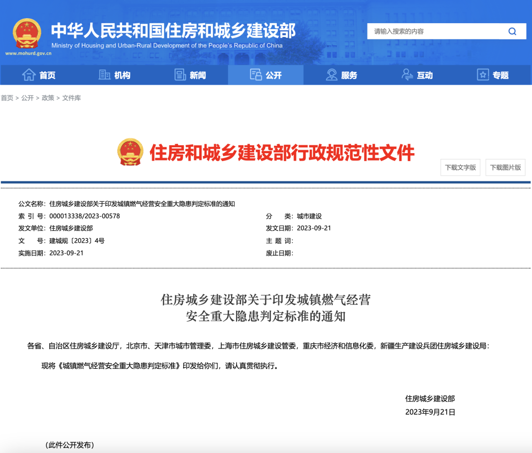 《城镇燃气经营安全重大隐患判定标准》