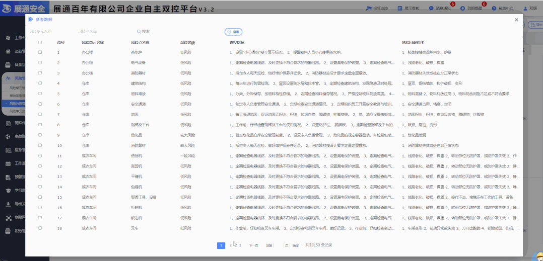 平台配置各类基础风险数据库,全面涵盖风险点、风险等级、事故类型、危险因素描述、管控措施等要素,为风险辨识与评价提供专业支撑。针对存在的风险点,实现从风险辨识、风险评价、风险分级管控的全过程管理,对应管控层级、管控频率、管控责任人及管控措施等情况一目了然,逐一落实公司、车间(部门)、班组和岗位的管控责任。