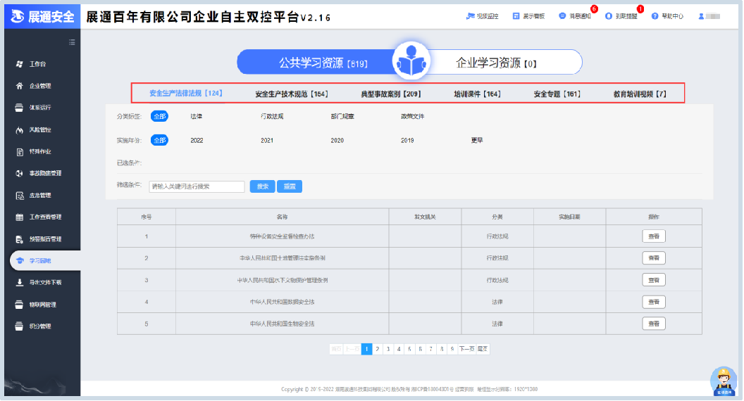 平台内置丰富多元的安全知识库,涵盖法律法规库、技术规范库、事故案例库、安全专题库、培训视频库等,企业可根据需要自主下载学习,全面拓展安全管理专业知识。