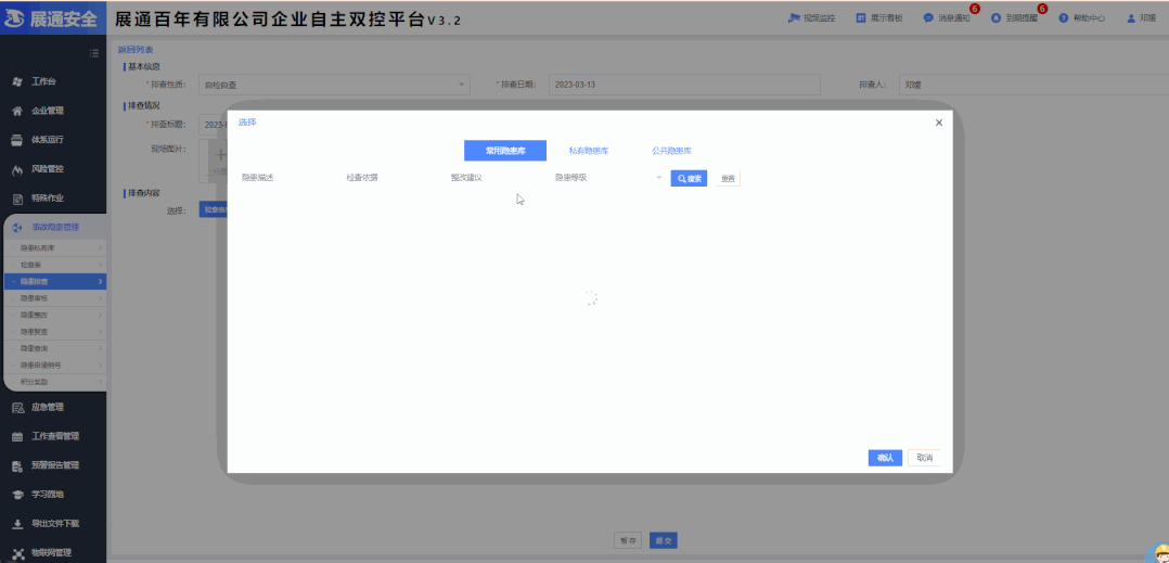 平台配置海量隐患数据库,提供精准全面的检查项目,并支持问题点关键词一键检索,对应检查依据、整改建议、隐患级别等情况自动匹配,快速完成隐患对标,提升隐患排查效率。