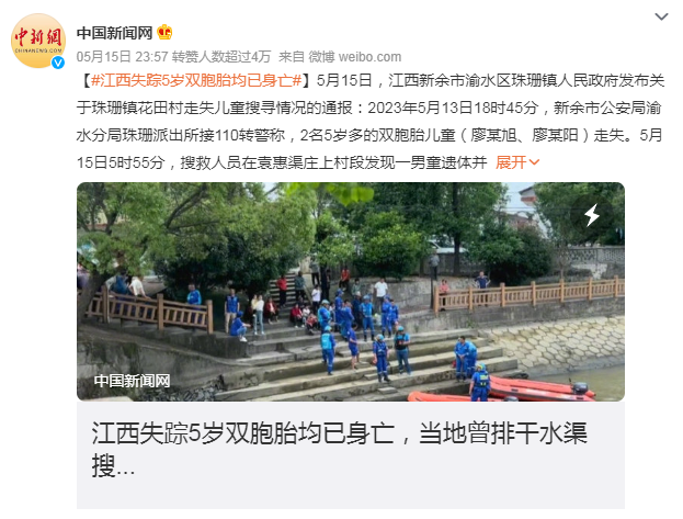 江西省新余市渝水区珠珊镇花田村一对5岁双胞胎男童在家门口失踪。5月15日,2名男童遗体分别在袁惠渠庄上村段、洋津段被打捞上岸,初步认定为失足落水身亡。