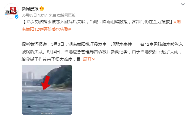 湖南益阳桃江县一名12岁男孩落水被卷入漩涡后失联。