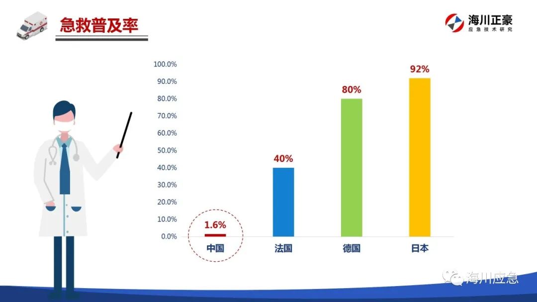 根据有关报道,目前发达国家的急救普及率是非常高的。其中,法国的急救普及率为40%;德国的急救普及率为80%;日本中学生的急救普及率更是高达92%。