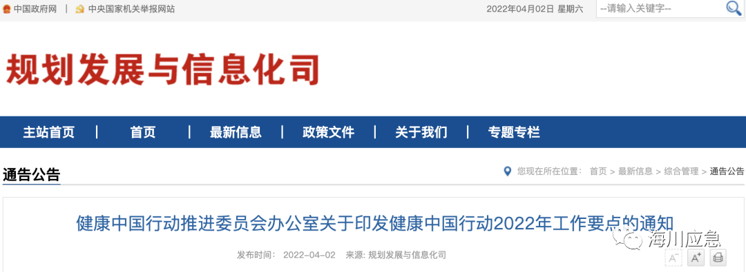 2022年4月2日,国家卫健委规划发展与信息化司发布的《关于印发健康中国行动2022年工作要点的通知》中要求:
