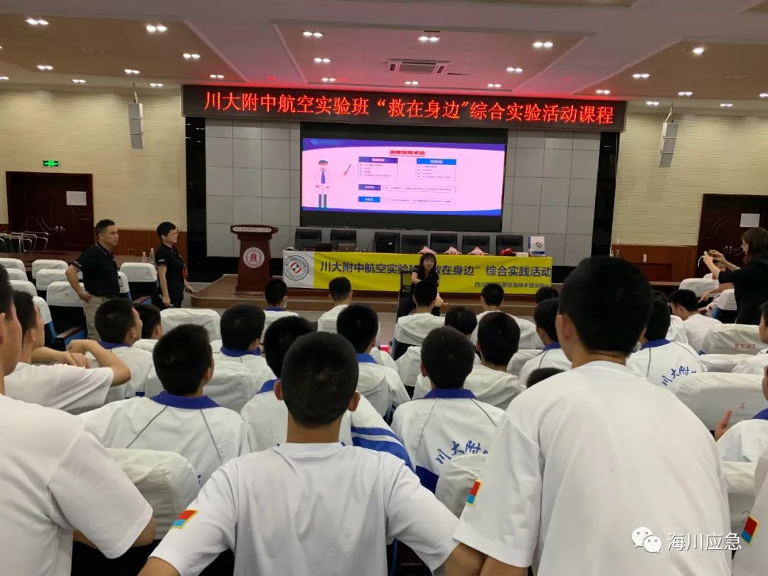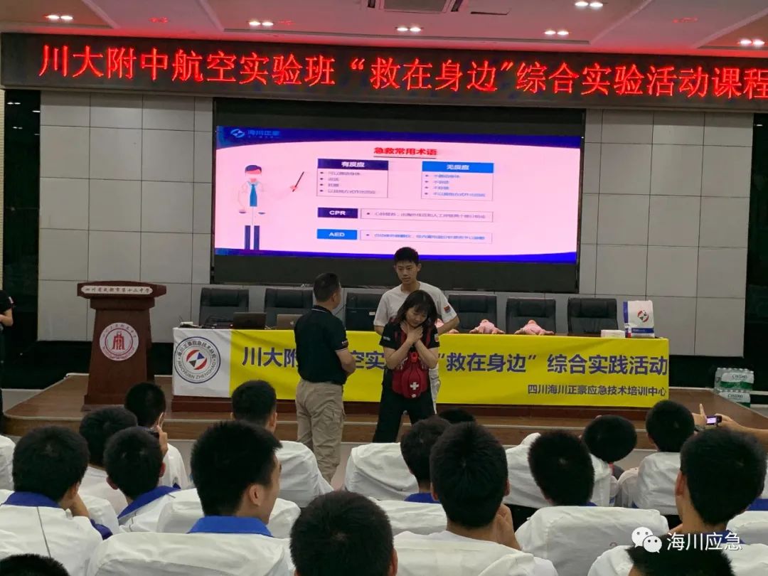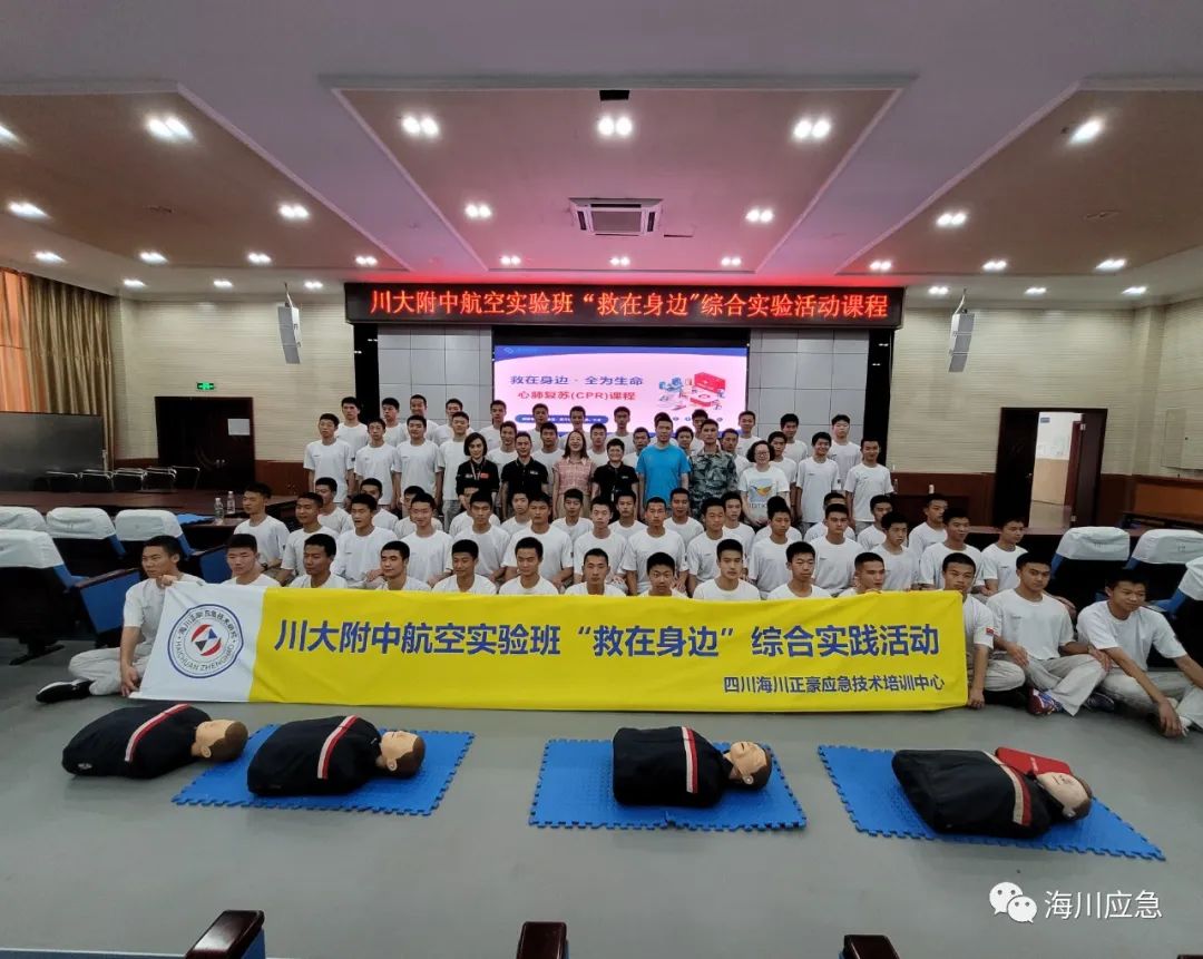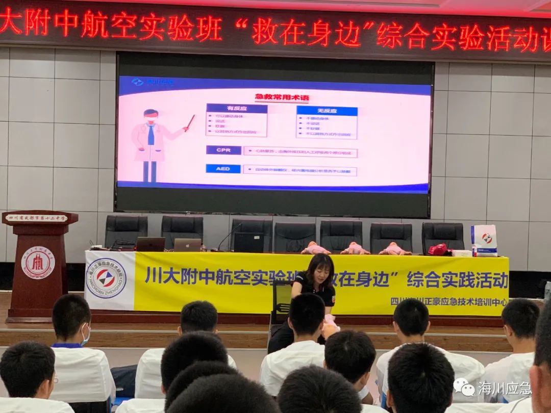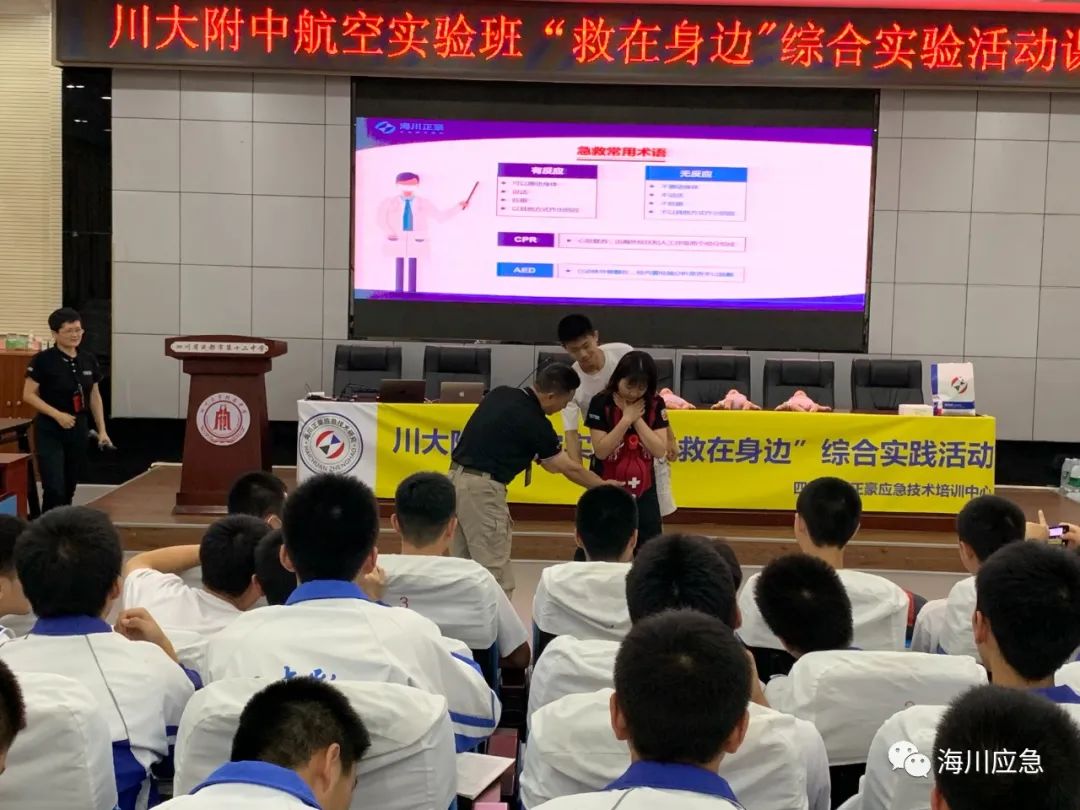 2022年5月27日,海川应急培训导师在川大附中进行了航空实验班“救在身边”综合实践活动,为同学们普及了急救基本知识,讲解了气道异物梗阻和心脏骤停的识别,演示了海姆立克急救法、心肺复苏术以及自动体外除颤器(AED)的使用等。