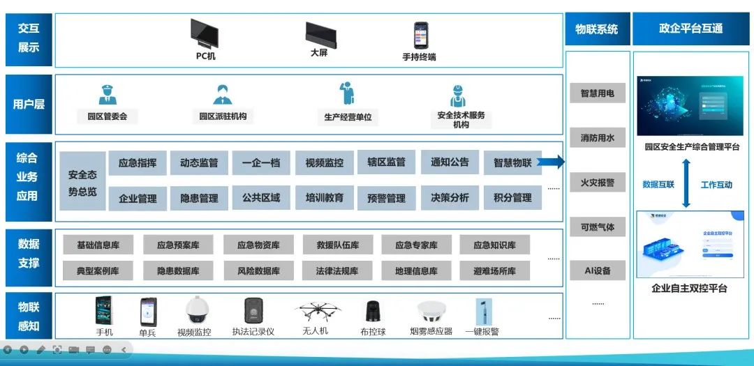 安全监管痛点及难点01园区内企业多,产业关联,布局紧凑,一旦发生安全事故,易波及园区其他企业,导致事故扩大,增加安全管理和应急救援工作难度。02园区未形成企业管理系统,企业底数不清,信息滞后,与上级监管主体不产生联动,不能形成信息传输通路。03园区应急资源情况不明,指挥人员无法精准掌控应急救援现场全局信息,缺乏事故现场处置情况的科学判据。04企业安全管理水平参差不齐,安全管理人员缺乏专业知识,主体责任难落实。05安全监管责任不明确、安全检查流程不清晰,安全隐患未形成有效的闭环管理。平台介绍园区安全生产综合管理平台集应急指挥、动态监管、一企一档、视频监管、重大危险源、智慧物联等等多项功能于一体,为安全生产、安全防控、监测预警、应急救援等工作提供智能化解决方案。通过整合园区内各方资源,推进信息的共享共用,实现园区管委会、派驻机构、企事业单位、专业服务公司多角色的参与,建立应急联动机制,强化灾害事故风险防控与隐患排查治理,保障园区安全可持续发展。平台研发架构平台作用01运用创新社会化服务的安全管理制度和方法,强化安全生产预防为主、源头治理与应急并重,加强风险分级与隐患排查治理,推动安全生产关口前移。02应急指挥整体调度,事故应急响应快,对辖区应急资源进行整合,实现一键调配,将事故的损失降至最低。 03厘清安全生产综合监管与行业监管的关系,便于更好地对企业开展安全监管工作。04多方联动,信息共享,协同监管,落实主体责任,保障辖区安全发展。平台特色安全底数清晰明了,科学监管综合决策风险分级动态管控,风险分布一目了然隐患管理追踪闭环,消息推送责任到人构建园区一企一档,重点部位实时监测应急资源高效整合,响应效率持续提升安全监管过程留痕,日常管理井然有序多方参与齐抓共管,信息共享过程留痕